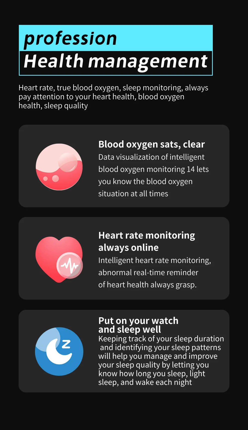 | 🛌 Health Monitoring | Steps, sleep, heart rate, blood oxygen, blood pressure, hydration, sedentary |